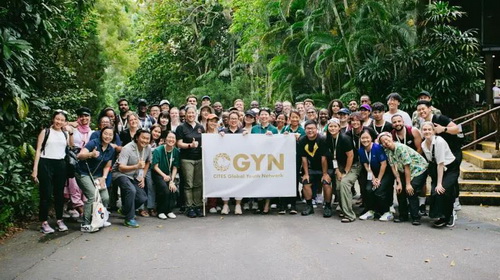 CITES秘书长伊沃妮·伊格罗 Ivonne Higuero(中间左侧持标语者)出席2024年在新加坡举行的CITES全球青年网络启动活动。照片:Shenn Tan