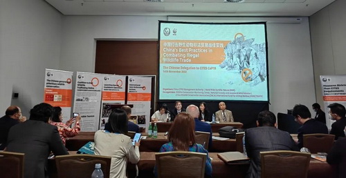 开幕式当天,由国家濒危物种进出口管理办公室和世界自然基金会联合主办,公安部七局、农业农村部渔业渔政局、海关总署缉私局、国家濒科委、国家林业和草原局野生动物保护监测中心、国际爱护动物基金会、国际野生物贸易研究组织和中国野生动物保护协会共同协办的“中国打击野生动物非法贸易最佳实践”边会顺利召开。国家林草局代表中国代表团系统介绍了中国在法律法规建设、部门协调配合、日常执法监管、联合打击行动、国际执法合作、宣传教育培训等方面的工作,分享了藏羚保护执法成果,敦促其他国家完善国内立法、提高执法能力、加强执法合作、全链条打击野生动植物犯罪,并会同公安部、海关总署回答了与会者的提问。来自缔约方、国际组织和新闻媒体共150多名代表参加了边会。