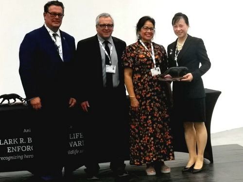 王蓓菁(右一)代表中国海关总署缉私局领取克拉克·巴文野生动物执法奖后与CITES秘书长(右二)等合影,图源:王蓓菁