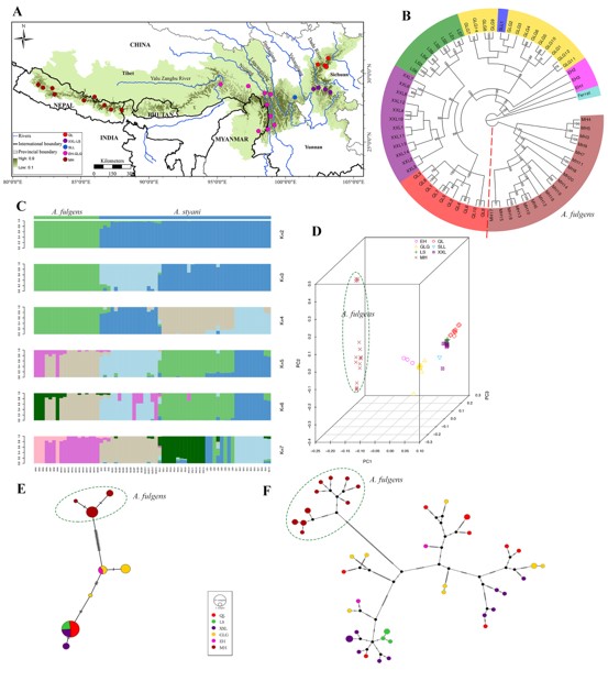 小熊猫(Ailurus fulgens)是目前仅分布在喜马拉雅-横断山脉区域的濒危哺乳动物,其栖息地分布涉及中国、缅甸、不丹、印度及尼泊尔等国家。基于小熊猫形态差异,1902年以来小熊猫被分为两个亚种:喜马拉雅亚种(A. f. fulgens)和中华亚种(A. f. styani)。近期有分类学家根据形态差异和地理分布,甚至将小熊猫两个亚种提升为物种,即喜马拉雅小熊猫(A. fulgens)和中华小熊猫(A. styani)。然而,长期以来,关于小熊猫亚种或物种划分存在争议,一方面是传统的形态划分特征在地理分布上不完全一致,另一方面一直缺乏遗传学证据的支持。此外,关于小熊猫亚种或物种从古至今的演化历史尚不清楚。