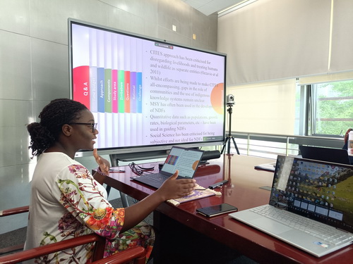 会上,两位TESA项目1期访问学者分别汇报了各自的工作。Nobesuthu Adelaide Ngwenya女士的研究题目是“津巴布韦卡万戈–尚比西保护区人象互作导致的社会心理问题研究”,她着重研究了津巴布韦近年来由于大象数量显著增加而导致的大象活动与社区居民冲突不断加剧的社会问题,并从科学指导、动物保护,社区管理和居民生计等方面为CITES更好地发挥作用提出了相关建议。Jacob Mueti Ngwava博士的研究题目是“肯尼亚CITES公约附录Ⅰ物种鉴别手册”,在为期3个月的TESA项目中,他整合此前已有的文献与研究结果,编写新的肯尼亚CITES公约附录Ⅰ物种鉴别手册,目前已完成肯尼亚CITES附录Ⅰ龟鳖目6个物种的编写工作,填补了多项信息空白。