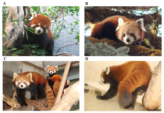 图1. 两种小熊猫不同的面部和尾部环纹毛色特征(中华小熊猫,A和C;喜马拉雅小熊猫,B和D)