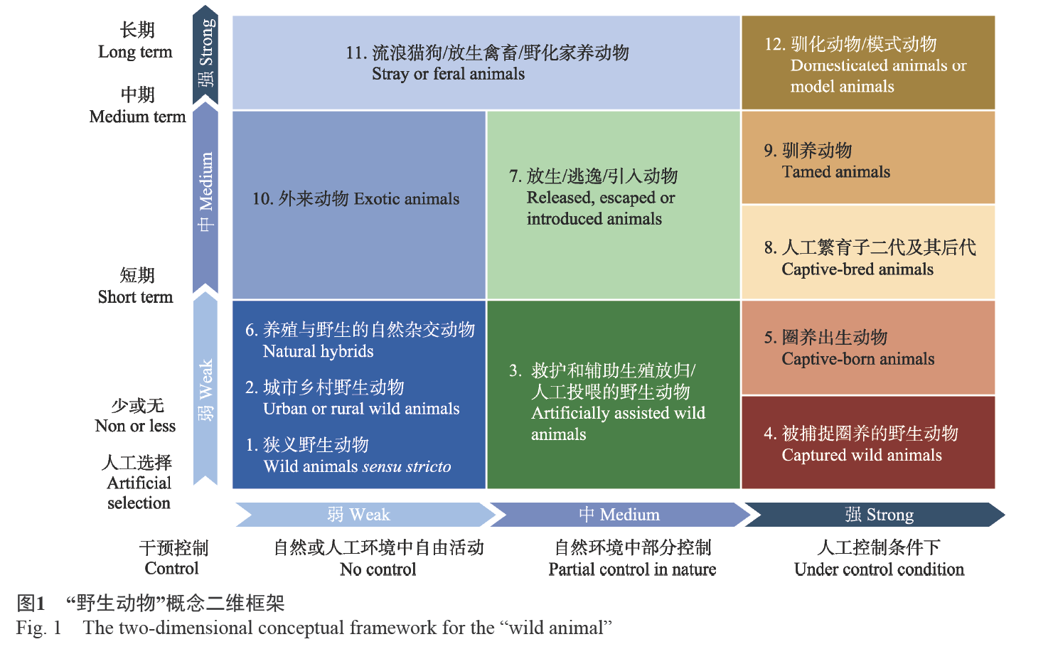为回答这个问题,挂靠在中国科学院动物研究所的中华人民共和国濒危物种科学委员会(国家濒科委)办公室梳理了野生动物相关研究、国内法和国际法背景下的定义和适用范围,提出了一种新的野生动物概念框架,以人类控制管理干预的强度和人工选择时间长短这两个维度的连续变化来描述“野生动物”。从物种保护和管理角度,考察了野生动物从野外种群到被捕捉、圈养到成为驯化动物的一系列过程,发现可能存在连续的12种状态。