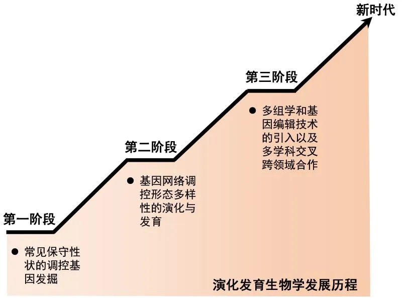 文中概括了现代evo-devo的3个发展历程。第一阶段是鉴定了大多数后生动物中常见保守性状的调控基因;第二阶段是揭示形态多样性是如何通过基因网络调控而演化和发育的;第三阶段是当下多组学和基因编辑技术的引入进一步增进对evo-devo机制的理解。