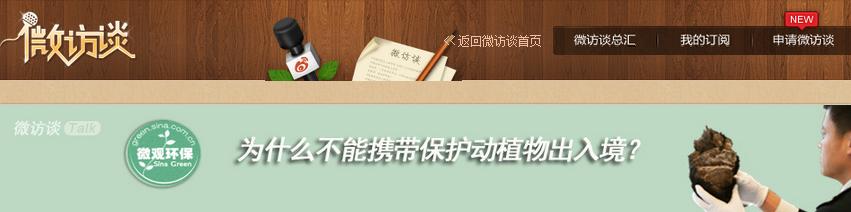 2012年9月12日下午2:30-3:30,“第四届中国野生生物卫士项目微访谈——为何不能携带保护动物出入境”在新浪微博上顺利进行。参加微访谈的嘉宾有:北京海关缉私局首都机场缉私分局李宏伟警官、北京海关首都机场海关旅检处高延军警官和中华人民共和国濒危物种科学委员会专家曾岩博士。微访谈为时60分钟,共提出43个有关携带、购买动物及制品出入境的问题,三位嘉宾合作回答了全部网友提问,详细解答了公众对这一话题的疑问及困惑。