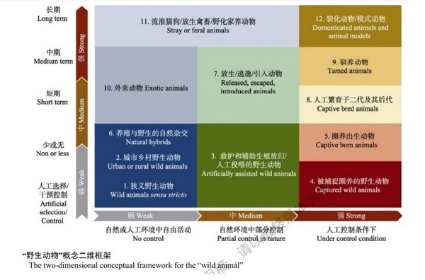 我们梳理了野生动物相关研究、国内法和国际法背景下的定义和适用范围,提出了一种新的野生动物概念框架,以人类控制管理干预的强度和人工选择时间长短这两个维度的连续变化来描述“野生动物“。